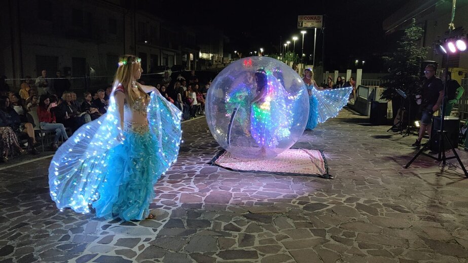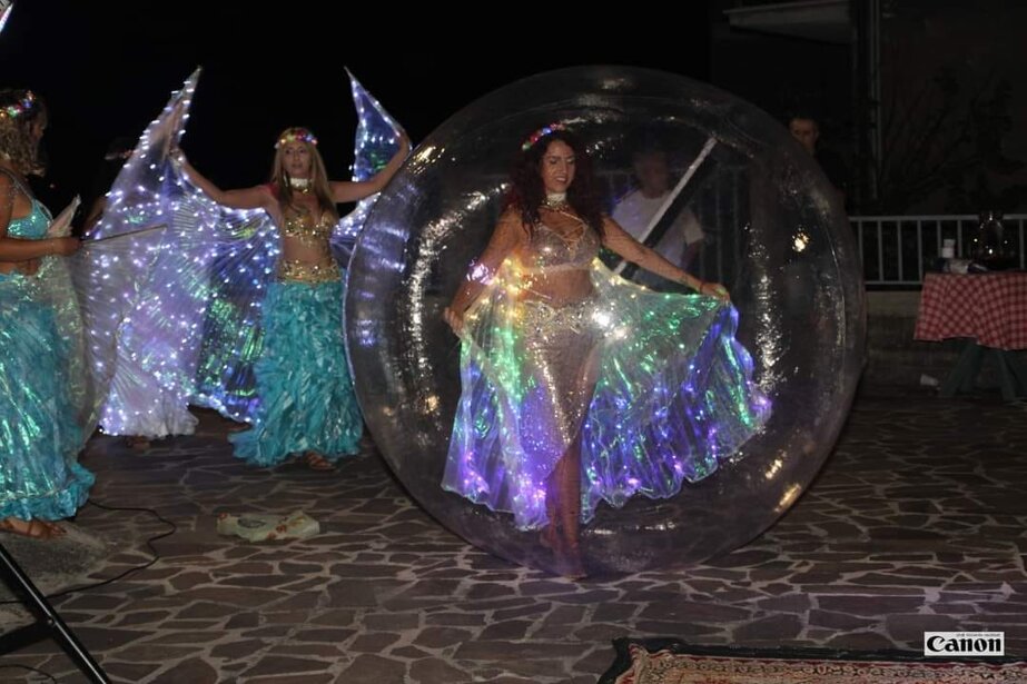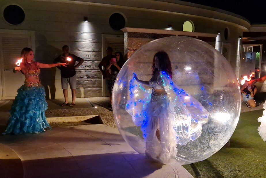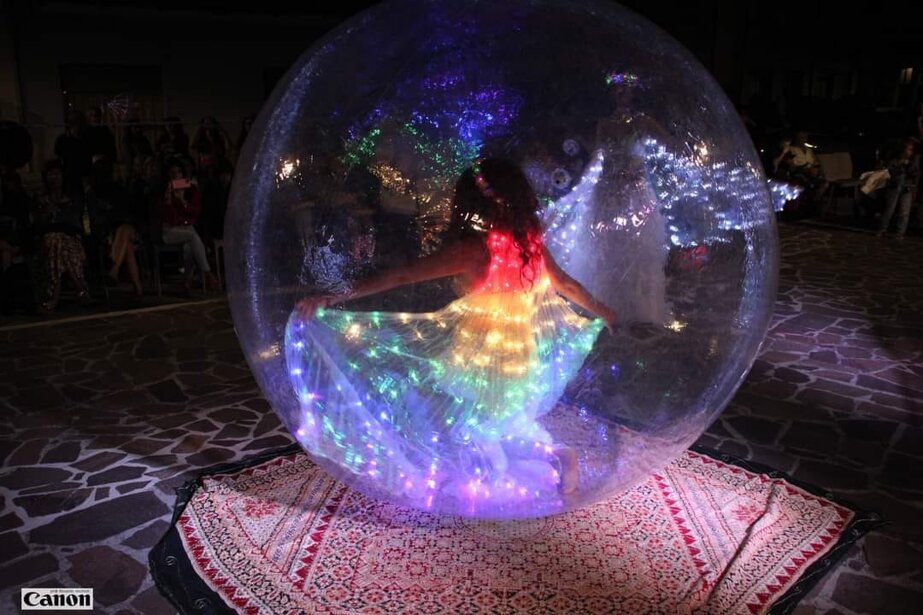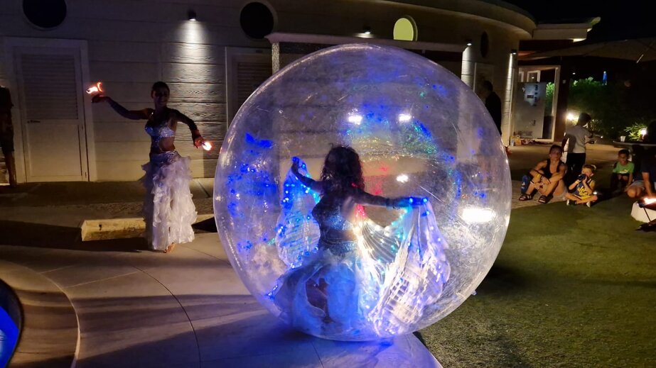 La nostra ballerina incanta il pubblico danzando all’interno di una bolla trasparente, creando un’atmosfera di sogno e meraviglia. Questo spettacolo unico combina eleganza, fluidità e il fascino della danza con un’ambientazione scenografica mozzafiato.